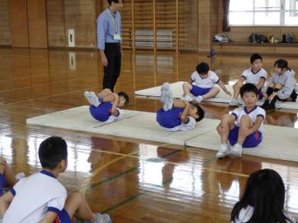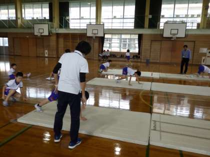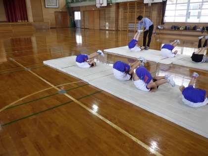 市スポーツ協会の指導員の方に、マット運動を教えていただきました。3年生は、基礎的なマット遊びやゆりかご、前転・後転などを練習しました。