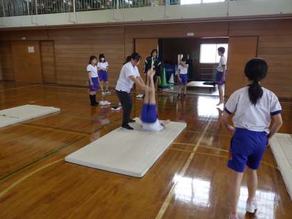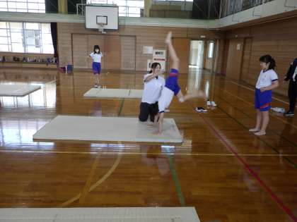 5年生は、学習発表会で披露する側転や倒立前転、グループ前転などを教えてもらいました。市スポーツ協会指導員の方、ありがとうございました。