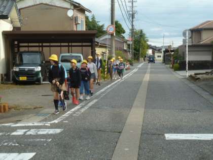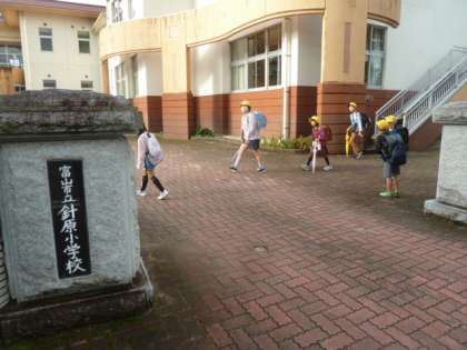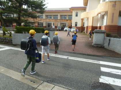 やや曇り空の朝、登校してきた子供たち。みんな長袖です。今週は、3・4年区域連合音楽会などがあります。