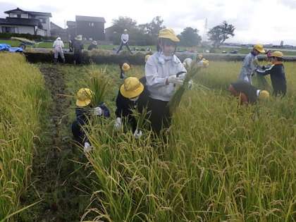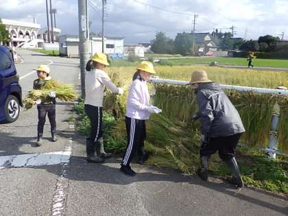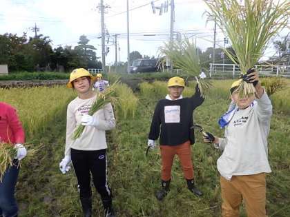 10月6日(金)5年生が稲刈り体験をさせてもらいました。鎌で一束ずつ稲穂を切り、集めました。だんだんと上手になり、収穫の喜びを味わいました。
