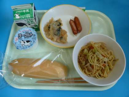 今日の献立は「焼きそば、あらびきウインナー、こんにゃくサラダ、コッペパン、ヨーグルト」でした。明日は学習発表会、30日(月)は振替休業日です。次の給食は31日(火)です。