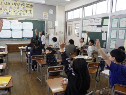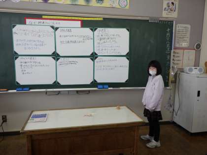 社会科では、なぜ神通川の流れが工事によって変えられたのか考えました。予想したことをグループで話し合い、学級全体で発表しました。資料をもとにして理由を考えることができました。