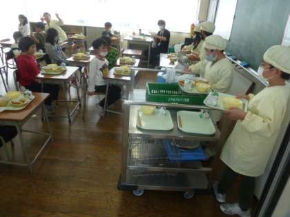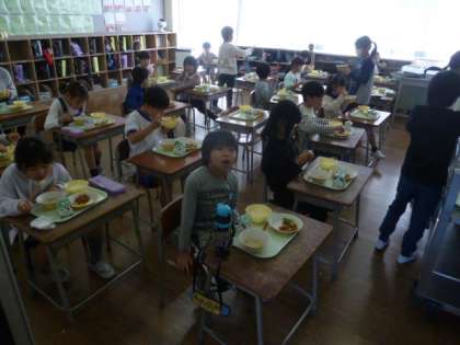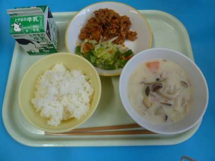 「ごはん、ポークチャップ、アスパラサラダ、秋の香りシチュー(じゃがいも、しめじ、さつまいもなど)」でした。★明日(11月2日)1・2年生は遠足で弁当昼食です。給食はありません。
