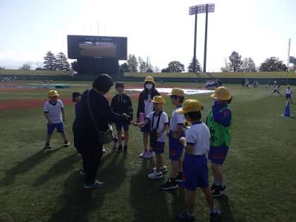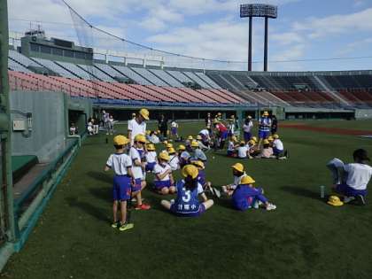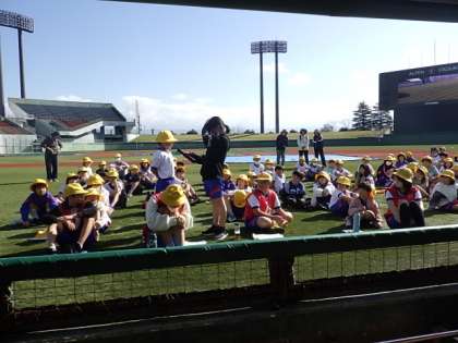 さわやかな秋晴れのもと、初めてアルペンスタジアムに全校で行って、なかよし班でジャンケンゲームやベースリレーなどで遊んだり、のんびりと飴を食べたりして、楽しい思い出をつくってきました。