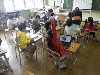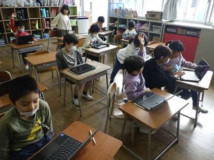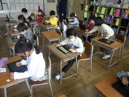 1年生がタブレットで「あさがお日記」をつくっています。写真や文字を入れるなど、中には何ページも画面をつくる子もいました。