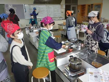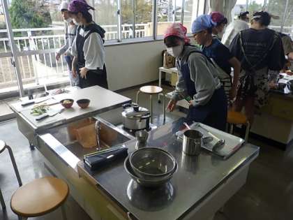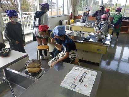 5年生が家庭科で調理実習をしました。鍋で米を炊き、煮干しで出汁をとり大根や油揚げの味噌汁をつくります。