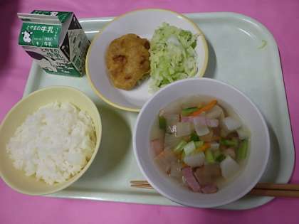 「ごはん、ポークパコラ(豚肉揚げ)、かぶのスープ、ゆでキャベツ」でした。
