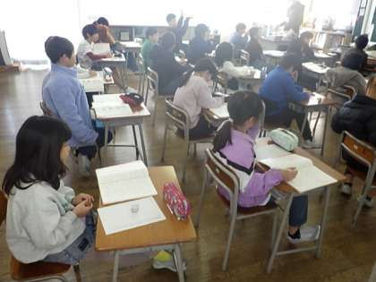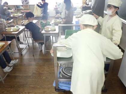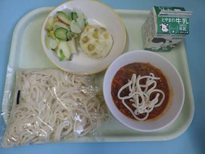 今日の献立は「ミートソースがけソフトめん、蒸しパン、白菜とリンゴのサラダ」でした。画像は、午前中、国語の漢字の学習をがんばって、おいしく給食を食べる3年生です。