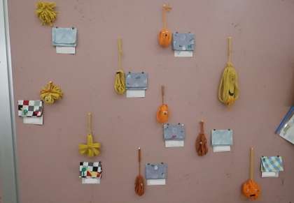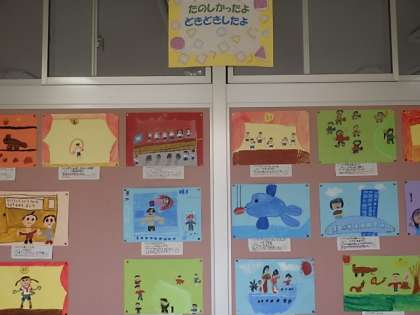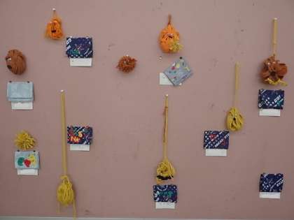 2年生は「2学期に楽しかったこと」を絵にして、また、4年生は毛糸で作った作品が廊下に飾ってあります。