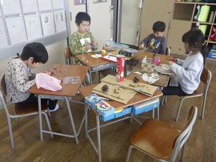12月6日(水)1年生 おもちゃをつくろう 公開日 2023/12/06 更新日 2023/12/06 学校の様子 1年生が生活科で、今まで拾って集めたどんぐりや松ぼっくり、箱、紙コップなどを使って、おもちゃづくりをしています。けん玉、迷路、楽器グループなどに分かれており、仕上げて、みんなで遊ぶのが楽しみだね!