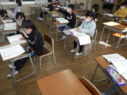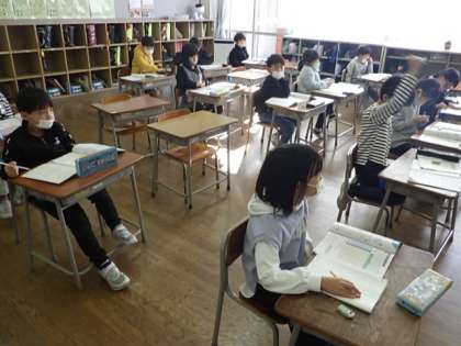 2年生が算数の「6×3=6×2+○?」という問題に取り組み、今まで覚えたかけ算・たし算の学習をためしています。ずいぶんと難しくなってきて、頭を悩ませています。