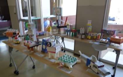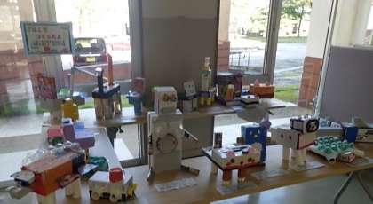 1年生の図工作品が廊下に展示してあります。四角や丸の箱、プラスチックケースなどで動物や乗り物をつくりました。個別懇談会にお越しの際にご覧ください。
