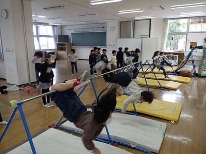雪が降り、外では遊べませんが、室内鉄棒に夢中になって遊ぶ子供が多くいます。中には、逆上がりや、もう少しでこうもりふりおり(←クリックミニ動画)ができそうな子供が何人もいます。