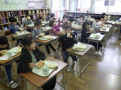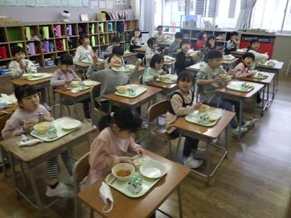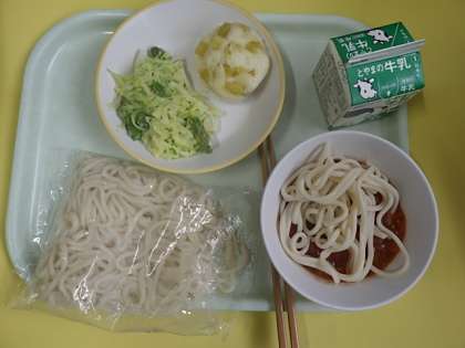 3学期最初の献立は「ソフトめん、ミートソース、蒸しパン、グリーンサラダ」でした。約45回の給食がある今学期も、おいしく安全にいただきます!