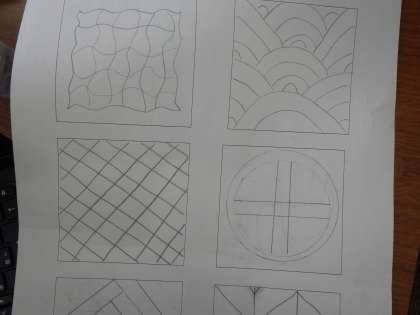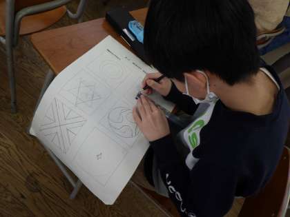 4年生図工で版画を始めました。小さなゴム版に模様を彫り、組み合わせて刷りながら作品を作ります。今日はいろいろな模様を想像して描きました。友達と見せ合いながらアイディアを出していました。