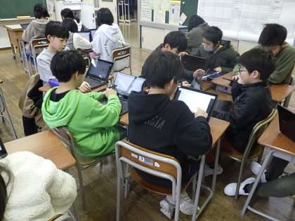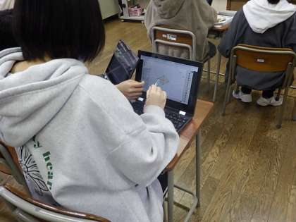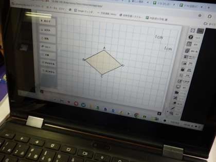 5年生が算数で、ひし形の面積の求め方を考え、タブレットで試したり友達と教え合ったりしています。