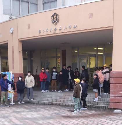 研精委員会が呼びかけた朝のあいさつ運動に、多くの子供たちが参加しました。寒い朝でしたが、大きな声で元気よく友達を迎え入れています。
