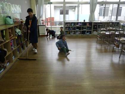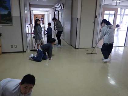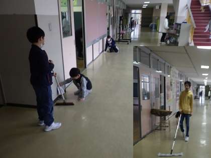 2学期後半にはインフルエンザ感染でできなかった「なかよし清掃」を行っています。縦割り班の異学年で、協力・分担して掃除をしています。