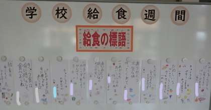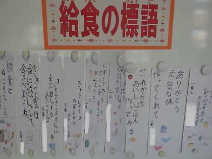 1月23日(火) 給食週間標語 公開日 2024/01/23 更新日 2024/01/23 学校の様子 今週は給食週間。全校児童が、おいしい給食や調理員さんへの感謝の気持ちを表した標語を書きました。何点か給食の放送で紹介したり掲示したリしています。