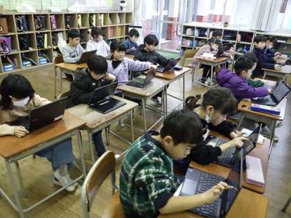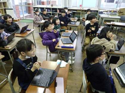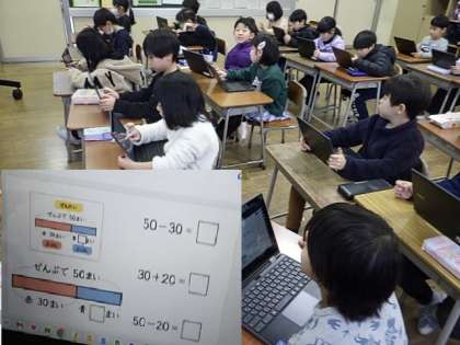 2年生が、2位数(◯十)のたし算ひき算の学習のまとめを、タブレットでしています。画面やスクリーンにうつして答え合わせをしました。