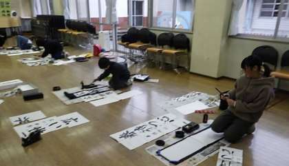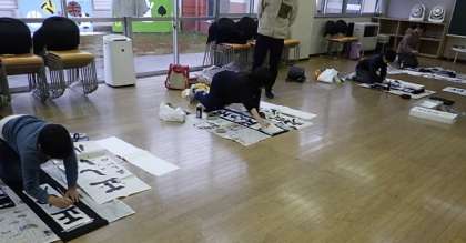 昨日(1日)県書き初め大会に参加する3〜6年児童4人が放課後残って習字の練習をしました。同じ題字ですが、校内大会より大きい筆や紙で書きます。2月12日大会本番まで練習がんばります。