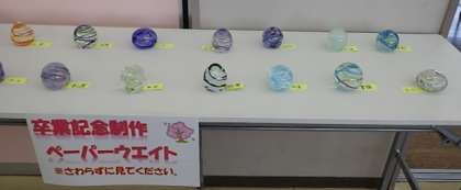 6年生の廊下には、ガラス工房で作った美しいペーパーウエイトや、オリジナルテープカッターが展示してあります。卒業制作を学習参観の際にご覧ください。