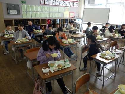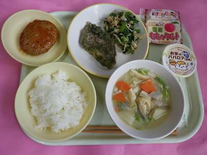 今日は今年度最後の選択献立。「ごはん、ハンバーグか魚の磯辺揚げ、はりはりあえ、具だくさん汁、桃のタルトかお米のババロアでした」と紹介する給食委員とおいしく食べる3年生(上の画像は全部のせの場合)