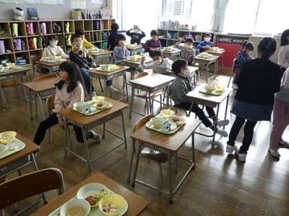 今日は「赤飯、とんかつ、コーンあえ、みそ汁、さくらゼリー」という「卒業お祝い献立」でした。※休んでいる2年生には、金曜の給食で、さくらゼリーが出る予定です。