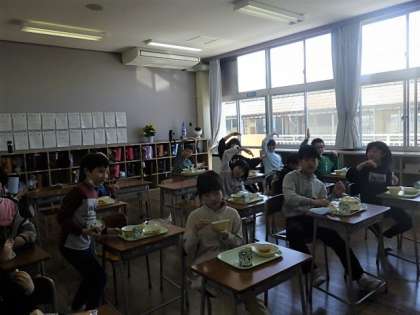 今日の給食は、久しぶりのコッペパンでした。今週から給食が始まり、1年生も配膳が少しずつ上手になってきています。「おいしそう、早く食べたいな」「チャウダーがパンに合うよ」「コロッケがサクサクでおいしい」とどの教室からも聞かれました。給食が大好きな針っ子たちです。