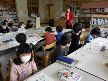 図書オリエンテーションの様子です。学期始めに、図書室利用の約束を改めて確認しました。言葉さがしゲームに熱中して取り組む子供たちの姿が見られました。