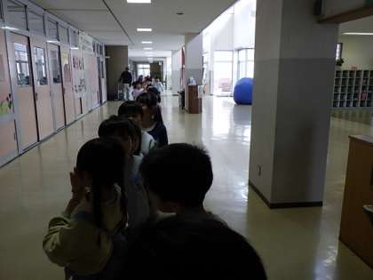 学校探検をしています。今回は会議室でした。会議室では、時計が他のことと違うことや絵が飾ってあることや歴代の校長先生の写真があることを見付けていました。