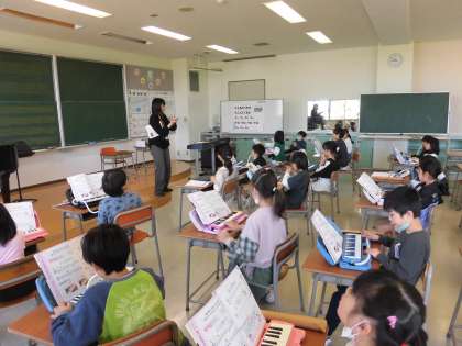 あおぞら級の子供たちの交流級での姿です。写真は、1年生の生活科、3年生の音楽の様子です。