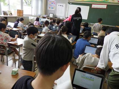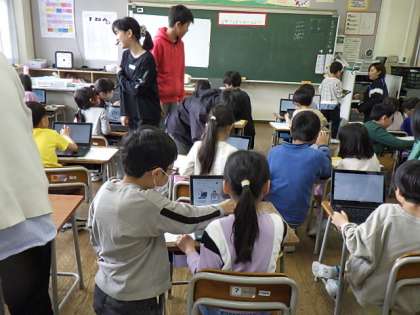 1年生では、6年生に教えてもらって初めて自分のパソコンを触ってみました。パスワードを打ったり、生活に関するアンケートに答えたりしました。これからまたパソコンを使っていきたいと思います。