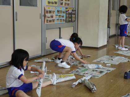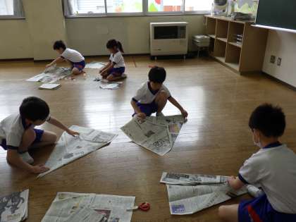 図工では新聞紙を使って自由に活動しました。新聞紙を小さくちぎって紙吹雪をつくったり、人形や服をつくったりしていました。