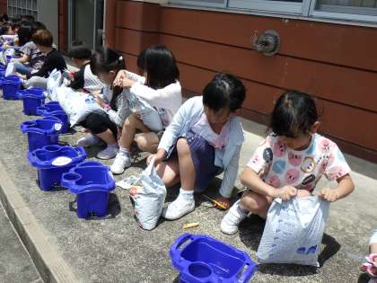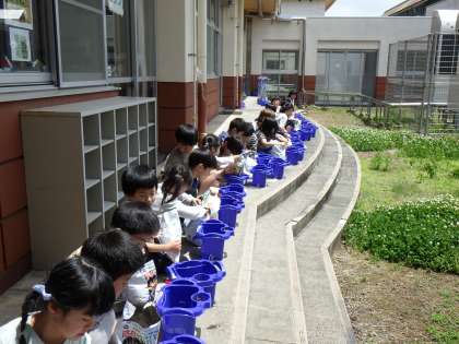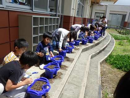 1年生は、アサガオの種をまきました。子供たちは、「どんな色の花が咲くかな」「早く芽が出てほしい」「いつ芽が出るかな」等と成長を楽しみにしていました。