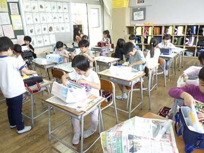 1年生では、運動会の絵を描きました。絵の具で空と地面の色に挑戦しました。初めての絵の具セットに大喜びでした。どんな道具があるのか調べてから、色を塗りました。
