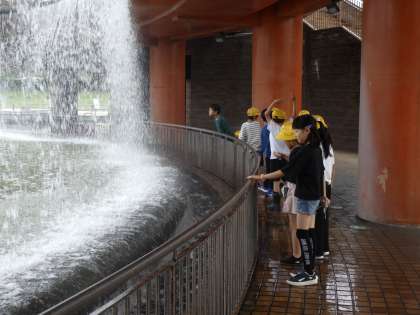 富岩運河環水公園で休憩しているときの様子です。気付いたことをメモに書き加えたり、友達と会話や歌を楽しんだりしていました。水がたくさん流れてきたときには、近くで涼みながら思い思いに過ごしました。