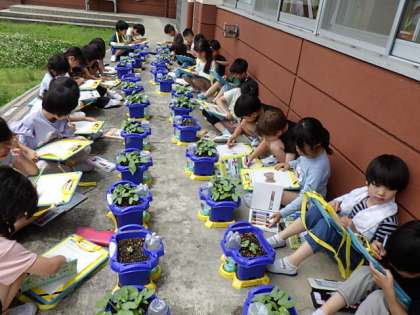 アサガオの観察をしました。アサガオが大きくなってきて、「違う形の葉っぱ(本葉)が生えてきた」とよく見ている子供、「葉っぱがいっぱいになった」と数に注目している子供等、思い思いの視点で自分のアサガオを観察しています。