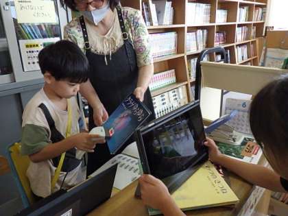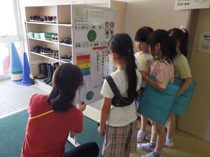 1年生では、生活科で学校探検をしています。お仕事体験をさせてもらうのをとても楽しみにしていました。校長先生、図書の先生、保健の先生グループです。