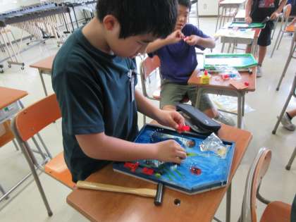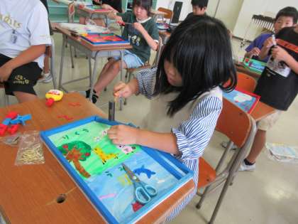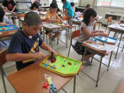 丁寧に製作を進めてきたコリントゲームも、いよいよ終盤です。子供たちは工夫しながら、思い思いに釘打ち作業をしています。完成した作品は、是非個別懇談会の際にご覧ください。