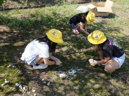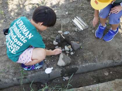 自然の中に生き物が好みそうなすみかを作る活動をしました。小さな生き物たちが、楽しく遊べる遊具や涼める空間を一生懸命作っていました。