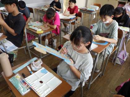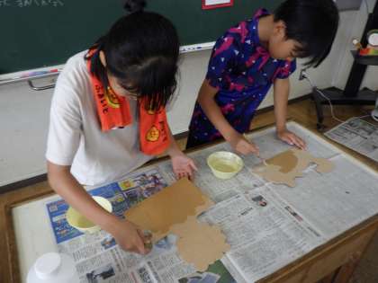 糸のこぎりで切り取った木版に色を塗りました。自分だけの伝言板が仕上がってきました。