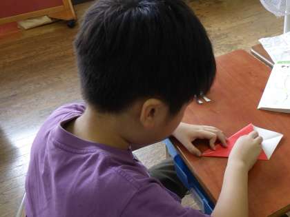 折り紙の本を見て、自分の好きな動物や恐竜、飾りなどをよく作っています。丁寧に折らないとうまくいかないということが分かってきて、紙がしっかりと重なるように折っています。