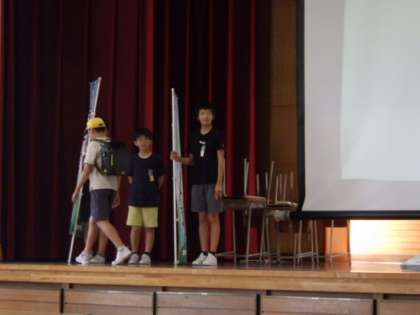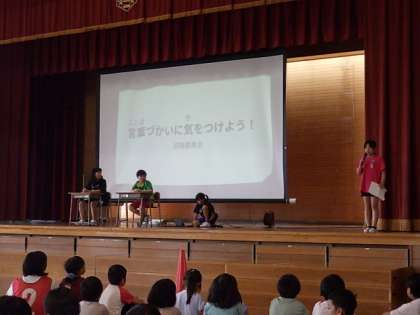 研精委員会の企画で集会を行いました。「言葉遣いに気を付けてフワフワ言葉を使おう」「名札を付けよう」について、劇を交えて発表があり、どんな言葉を使うとよいか考えたり、クイズに答えたりしました。よりよい針っ子を目指してみんなで取り組んでいきたいと思います。
