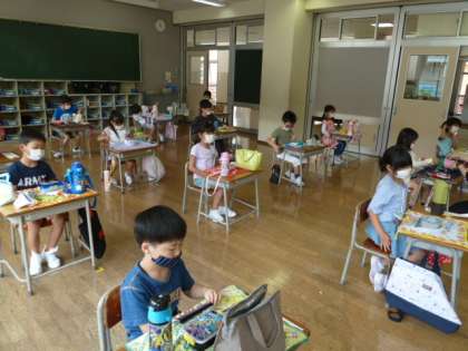 今日からお弁当をもって登校してきた子供たちです。1年生もしっかり手洗いと消毒をし、机の上にはランチョンマットの代わりの大きなハンカチ等を敷いてお弁当を広げました。朝から楽しみにしていたおいしいお弁当。みんな嬉しそうに食べていました。