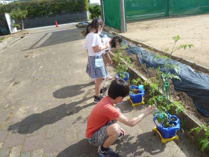 グラウンド横に並んだミニトマトに水やりをしているところです。気温が高くなってきたため、「たっぷりお水をあげなくちゃ!」とがんばっていました。また、青い実がついてきたのを見つけて、笑顔でみんなの苗を見つめていました。