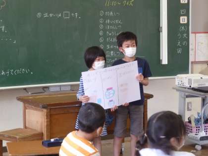 1年生に学校紹介をする準備を進めています。今日は、1年生に向けて出すクイズの練習をしました。お互いのクイズを聞き合い、1年生が楽しく学校のことを知ってくれるように、話し方も工夫していました。