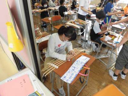 図画工作科では、紙の帯を編んでいき、オリジナルの小物入れをつくりました。