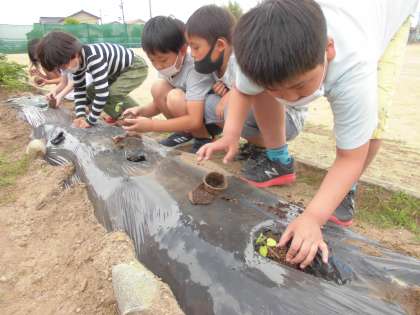 今までポットで育ててきた、ひまわりや、ホウセンカが大きくなってきたので、植え替えをしました。穴をほって、ポットからていねいに出して、植え替え完了!
