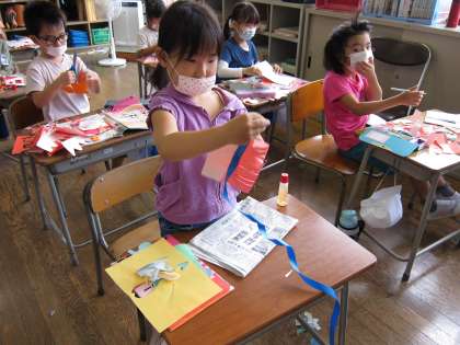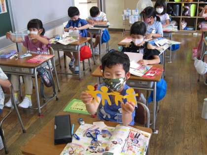 いろいろな折り方や切り方をしてみて、偶然できた飾りの面白さに気付き、子供たちは楽しんで取り組んでいました。